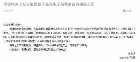 2019年11月7日凌晨,天貓官網發布聲明:“接監管部門要求,平臺于11月7日起對電子煙類商品采取下架商品、監管商品、刪除商品、限制發布商品、延長交易賬期、監管賬戶等措施?,F發現部分商家采取變異詞發布、錯放類目等方式,規避平臺的管理措施,違規發布和銷售電子煙產品,以上行為違反了國家的法律法規及政策規定,平臺將根據平臺規則從重處罰?!币馕吨嬲龑﹄娮訜煹幕ヂ摼W監管,現在已經無法在淘寶、天貓等渠道搜索到相關信息。