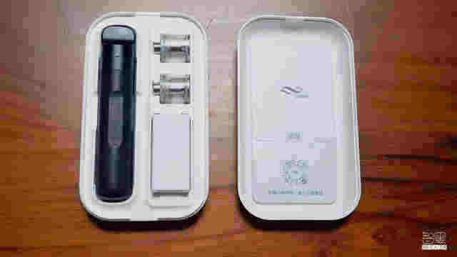 打開煙盒,可以看到電子煙本體一支,霧化倉兩個,還有一根USB充電線。說明書則是在“肥皂盒”的另外一側,這里值得一提的是說明書是嵌在盒中的,既不會浪費盒子的空間,又不容易弄丟。