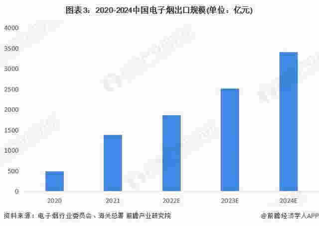 相較于全球800億美元的市場規模,我國電子煙消費市場還較小。海外龐大的電子煙消費市場帶動了國內電子煙的生產與出口,我國約90%的電子煙用于出口,數據顯示,2021年中國電子煙產業出口約1383億人民幣,同比增長180%。預計這一出口規模還將不斷增長,到2024年出口額將達到3402億元。