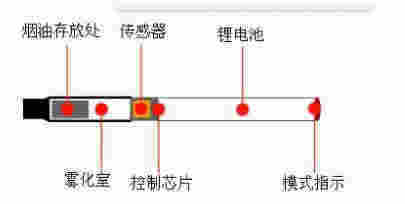電子煙主要由氣流監測器、控制電路、霧化頭、LED、鋰電池組成。吸煙時控制芯片可監測到氣流流動,控制加熱霧化頭使發出模擬煙霧,沒有氣流流過體內部時控制芯片進入到待機狀態。