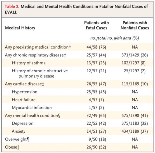 死亡病例的基礎病患病比例比非死亡病例的要高。比如23%的死亡病例有哮喘病史,非死亡病例中該比例為8%。死亡病例47%有心臟病,非死亡病例為10%。死亡病例中65%有精神病史,非死亡病例有精神病史的是41%。死亡病例中52%患有肥胖癥。