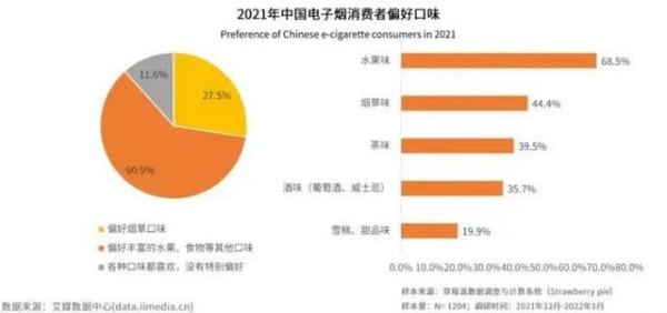 如果說,煙草、酒精、茶葉、果汁、咖啡是通過刺激生理機能抵達精神享受,從而讓人上癮,那么“調味電子煙”似乎是集所有“上癮”元素于一身的產品。艾媒咨詢調研數據顯示,中國電子煙消費者更偏好豐富的水果、食物等口味的電子煙,其中,最喜歡的電子煙口味是水果味,樣本調查中,占比達68.5%。