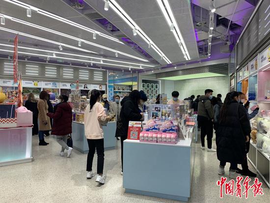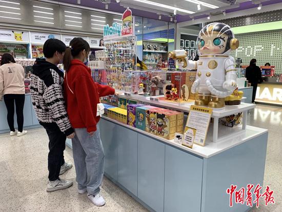 一個周四的晚上8點半,盲盒店里的客人仍然絡繹不絕。顧客看上去基本都是20歲上下的年輕人,有年輕的小情侶,有好閨蜜,也有志趣相投的好哥們兒,還有一些年輕的家長帶著上小學的孩子。