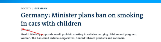 7月16日消息,近日德國衛生部正在推動一項禁令,該禁令將禁止在兒童和孕婦乘坐的汽車內吸煙,吸食產品范圍涵蓋卷煙、電子煙、加熱煙草產品和大麻。