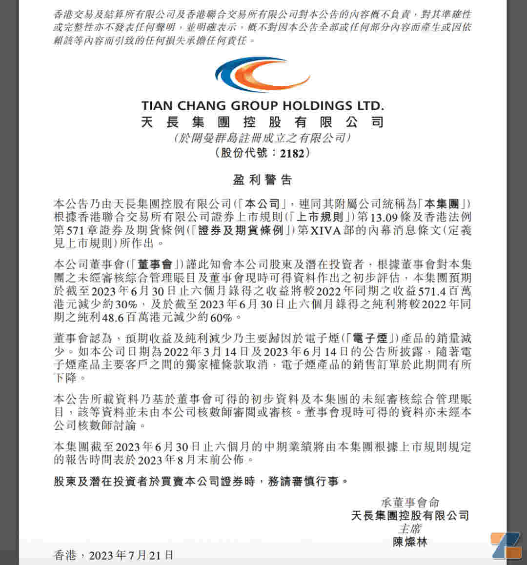董事會認為,預期收益及純利減少乃主要歸因于電子煙產品的銷量減少。如本公司日期為2022年3月14日及2023年6月14日的公告所披露,隨著電子煙產品主要客戶之間的獨家權條款取消,電子煙產品的銷售訂單于此期間有所下降。