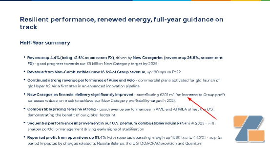 近日英美煙草(BAT)發布半年度業績報告,在截止2023年6月30日的前六個月,其收入增長4.4%,新型煙草表現優異;非燃燒產品收入占集團總收入的16.6%;報告的運營利潤增長61.4%。新型煙草的財務表現大幅改善,對集團利潤貢獻2.01億英鎊,計劃在2024年實現這一業務的盈利目標。