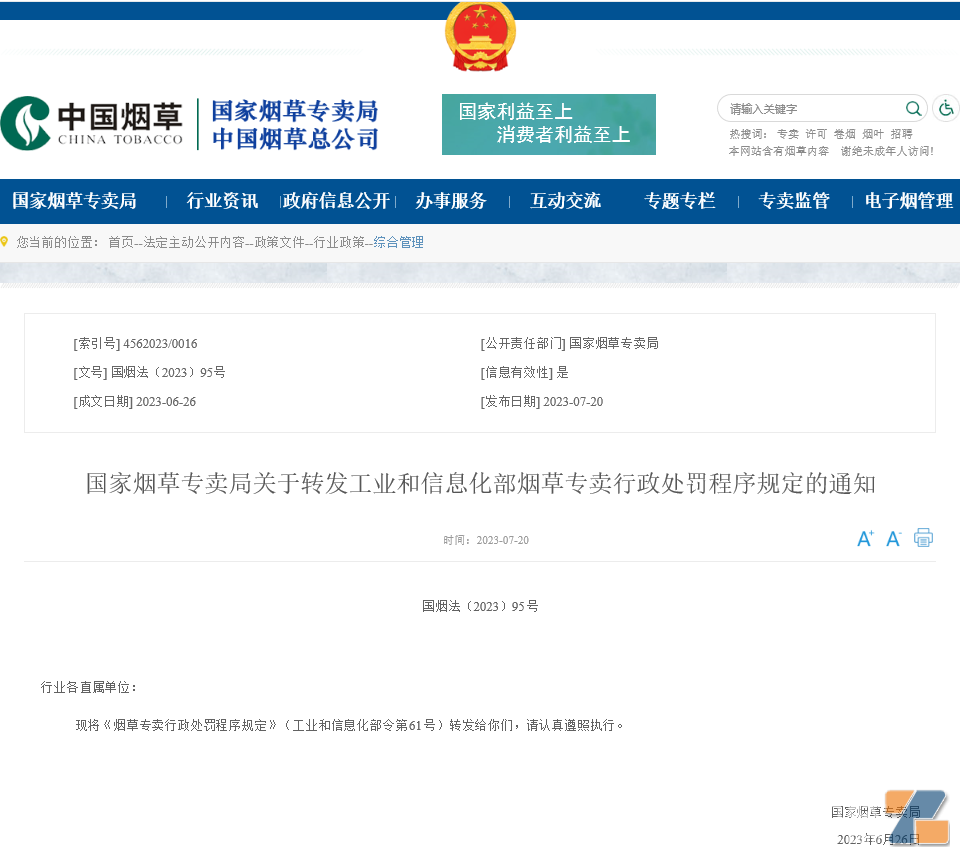 由工業和信息化部修訂并公布的《煙草專賣行政處罰程序規定》,已于2023年7月20日開始施行,2010年1月21日公布的《煙草專賣行政處罰程序規定》同時廢止。