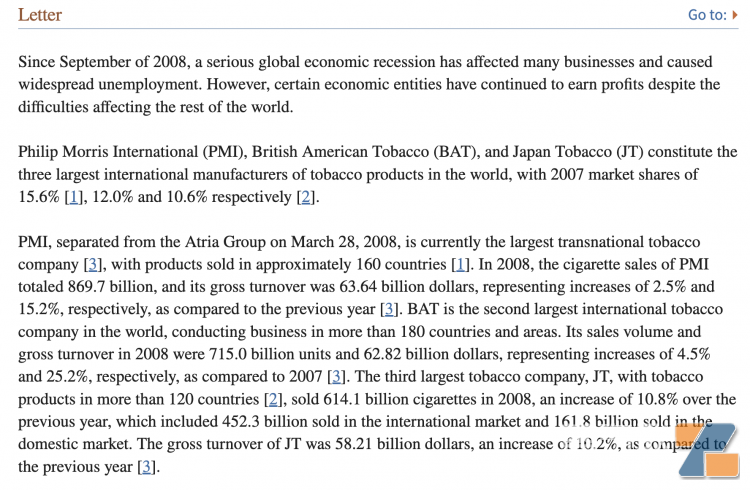 其中提到,2008年,PMI營業額為636.4億美元,比上年分別增長2.5%和15.2%。英美煙草公司總營業額達到628.2億美元,比2007年分別增長4.5%和25.2%。日煙國際總營業額為582.1億美元,比上年增長10.2%。