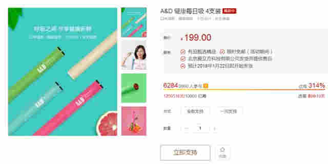 前幾天的時候,小米眾籌上架了一款“A&D健康每日吸4支裝”,眾籌價199元,號稱是一款可以吸的膠原蛋白棒,由北京膜立方科技有限公司發貨并提供售后,預計2018年1月22日起開始發貨。