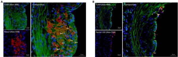 確實,在細胞層面的分析,電子煙油下的小鼠呈現出血循環中單核細胞更高表達TLR9,而且在經典單核細胞群中遷移相關分子CCR2+占更高比例,同時在斑塊中雙免疫熒光染色顯示巨噬細胞是其中表達高水平TLR9的主要細胞類型。