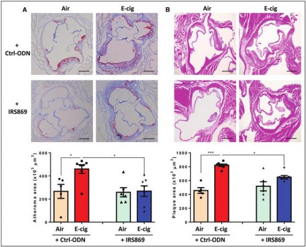 因此,研究人員使用TLR9拮抗劑(IRS869,5 mg/kg,1周2次)確認TLR9是不是介導電子煙霧造成斑塊擴大的關鍵因素。