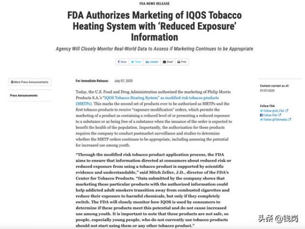 2020年7月7日,國際煙草巨頭菲莫國際旗下的加熱不燃燒設備IQOS和適配的煙彈通過美國食品藥品監督管理局(FDA)認可,成為首個通過FDA認證的電子型減害煙草制品(MRTP)獲準在美國市場進行推廣。 通過FDA認證意味著世界上要求最嚴格的美國食品藥品監督管理局(FDA)認可從傳統卷煙轉換到使用加熱不燃燒制品對大眾健康是有助益的。菲莫國際的加熱不燃燒系統通過MRTP認證,不僅僅是菲莫國際的勝利,同時也意味著加熱不燃燒制品這個品類的減害性質得到了國際權威組織的認可。