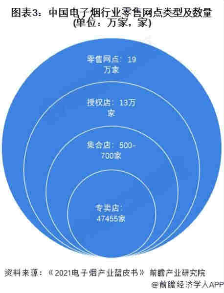 根據《藍皮書》的數據,截至2021年末,國內的電子煙零售網點數量達到了19萬家,其中單獨經營一個品牌的專賣店約4.75萬家。