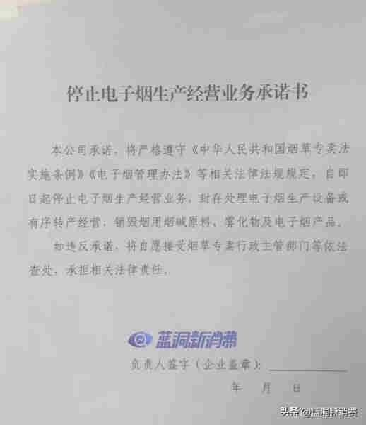 承諾書要求未持證企業承諾遵守煙草專賣法實施條例和電子煙管理辦法規定,自簽署之日起停止電子煙生產經營業務,封存處理電子煙生產設備或有序轉產經營,銷毀煙用煙堿原料、霧化物及電子煙產品。