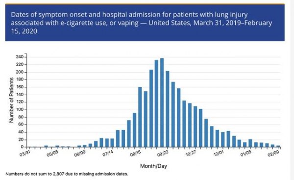 2019年9月,美國疾病控制與預防中心(CDC)報告了來自36個州的380例確認或疑似的“電子煙疾病”病例,其中至少7人死亡。這個數字經過一次修改,曾經是450例。后來美國疾控中心將定義收窄,只有胸部X光異常、近期吸過電子煙,所有檢測已經完成的病例才被計入。